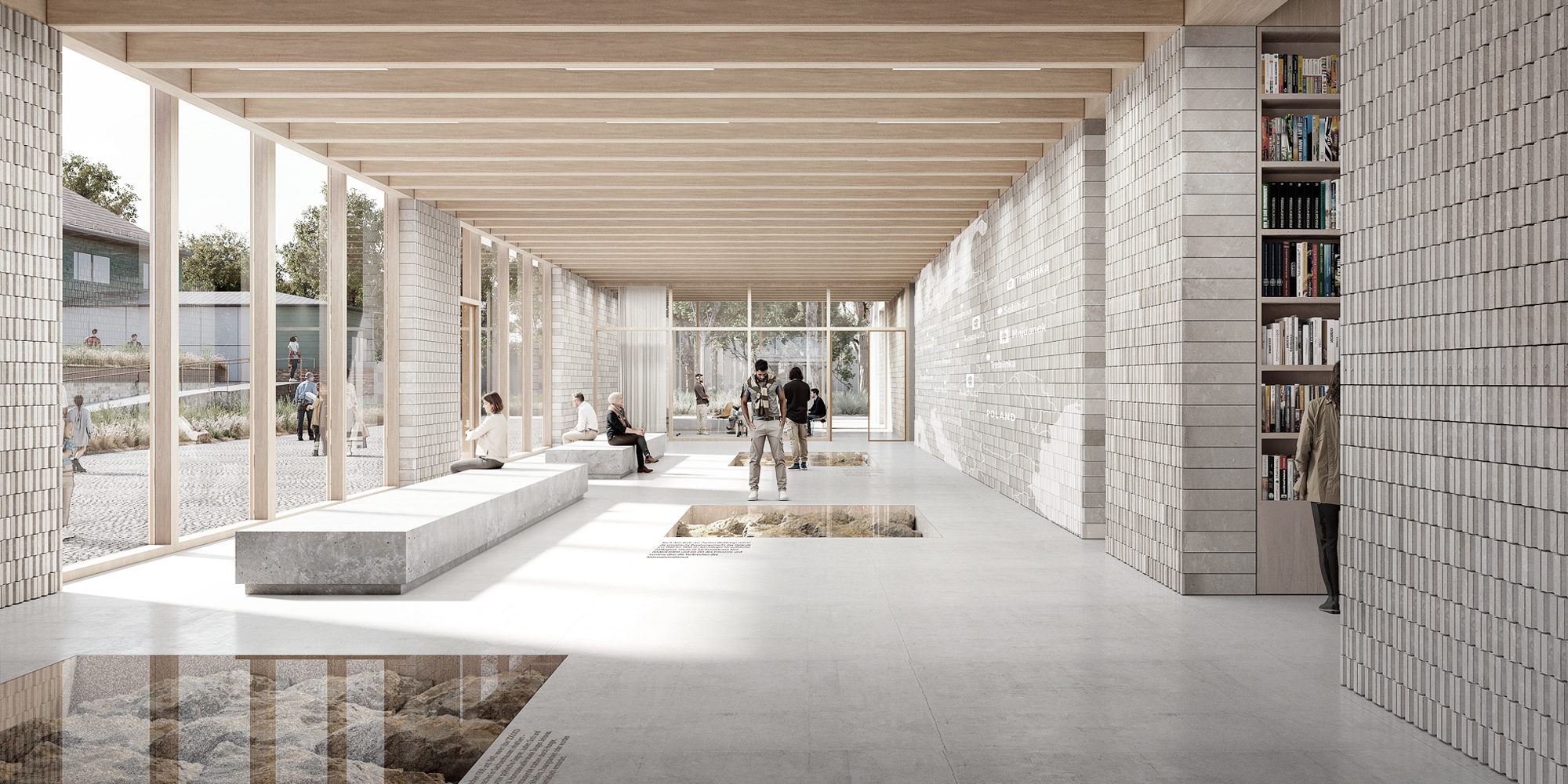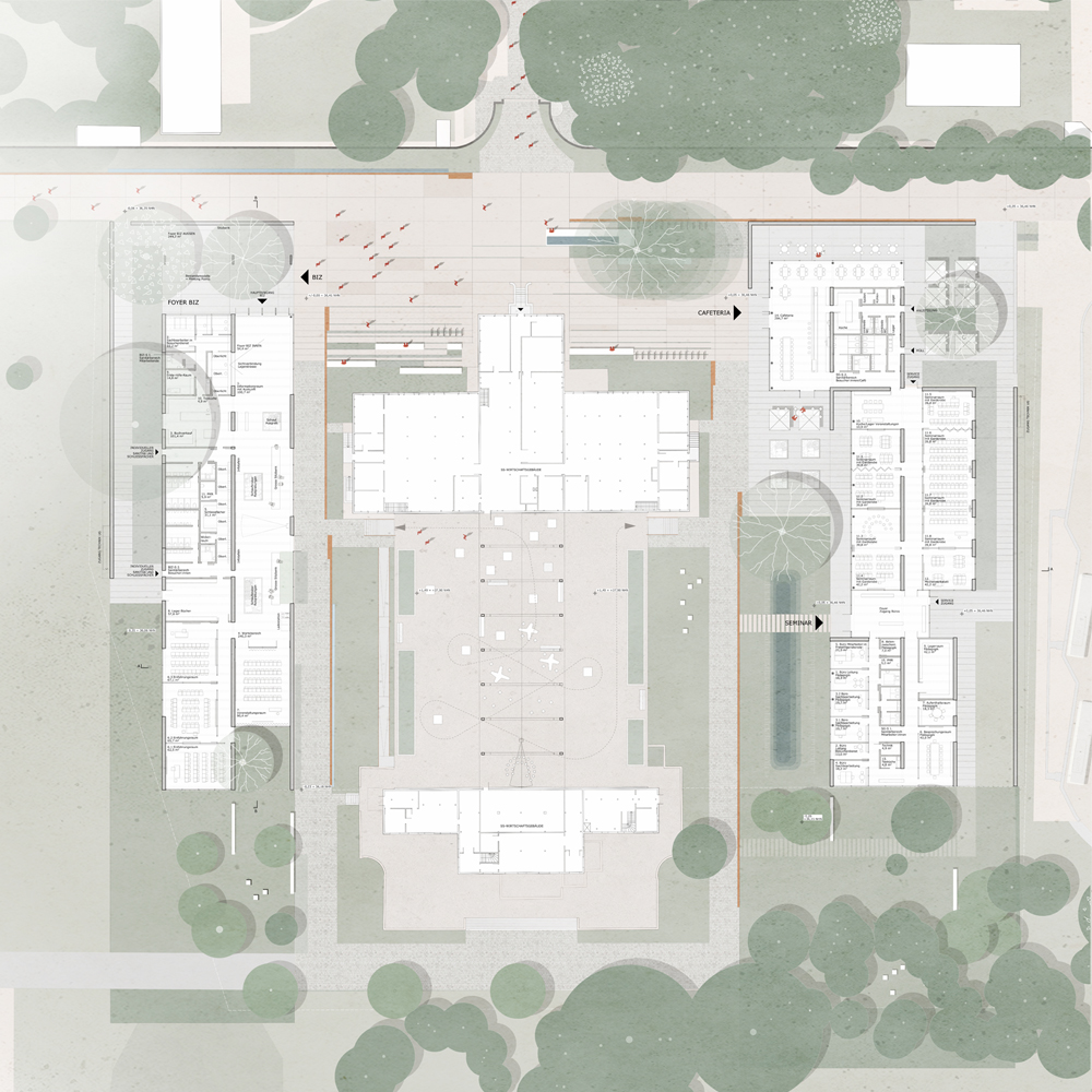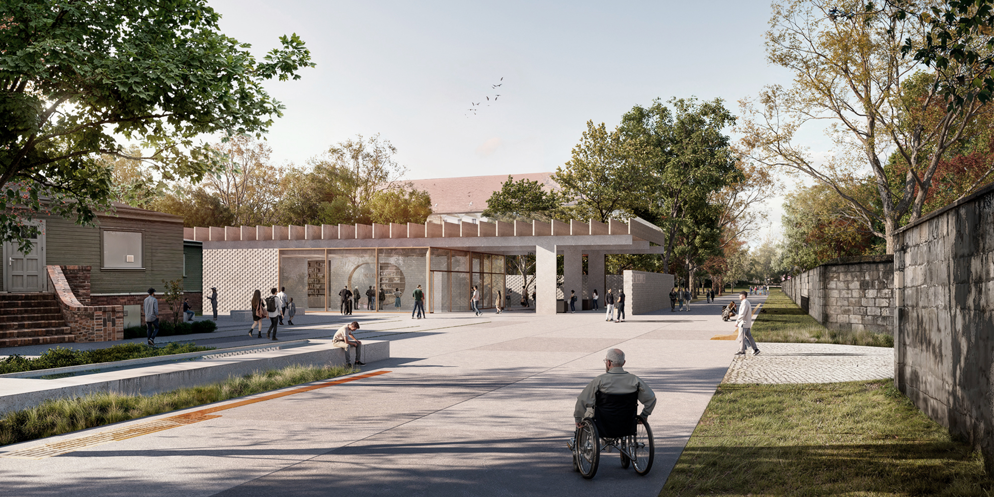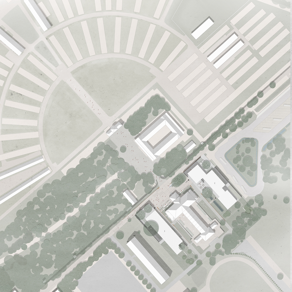 ● A new gate around the SS Wirtschaftsgebäude: the program is divided in two buildings that together with the SS building define an articulation Plaza at the main entrance of the Camp. The Biz at the southwest side and the Seminar/Café at the northeast side of the Plaza, both creating a porous ensemble together with the SS. The BIZ has an outdoor and covered Foyer where the three exisiting models are relocated. The main acces to the Café is made through the Plaza. The volume of the Seminar is articulated to create a quiet outdoor space of entrance, in relation to the SS building and featured by the huge existing tree, the foundations ruins and water management bodies. The SS building is relaunched as an active platform, as a contemporary ruin with a minimun and reversible intervention.