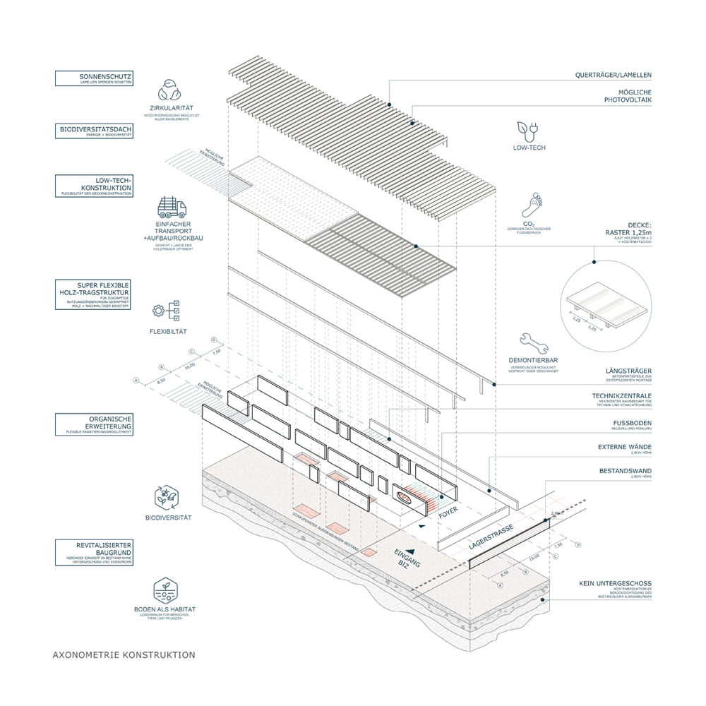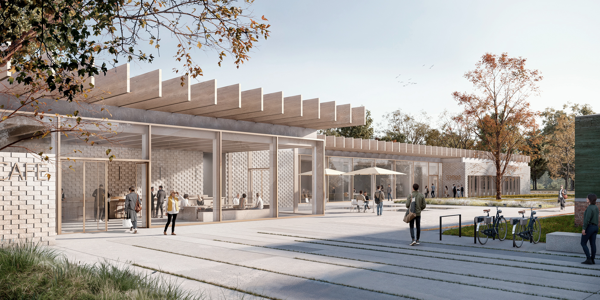 The morphology of long pavilions-like intervenction is also an echo of the former logics of the site, composed by addition of narrow and long buildings. Also a legacy of the existing foundations from the historic adjacent building of the SS one, which are integrated in the BIZ with windows on the floor and in the outdoor access area of the Seminar.